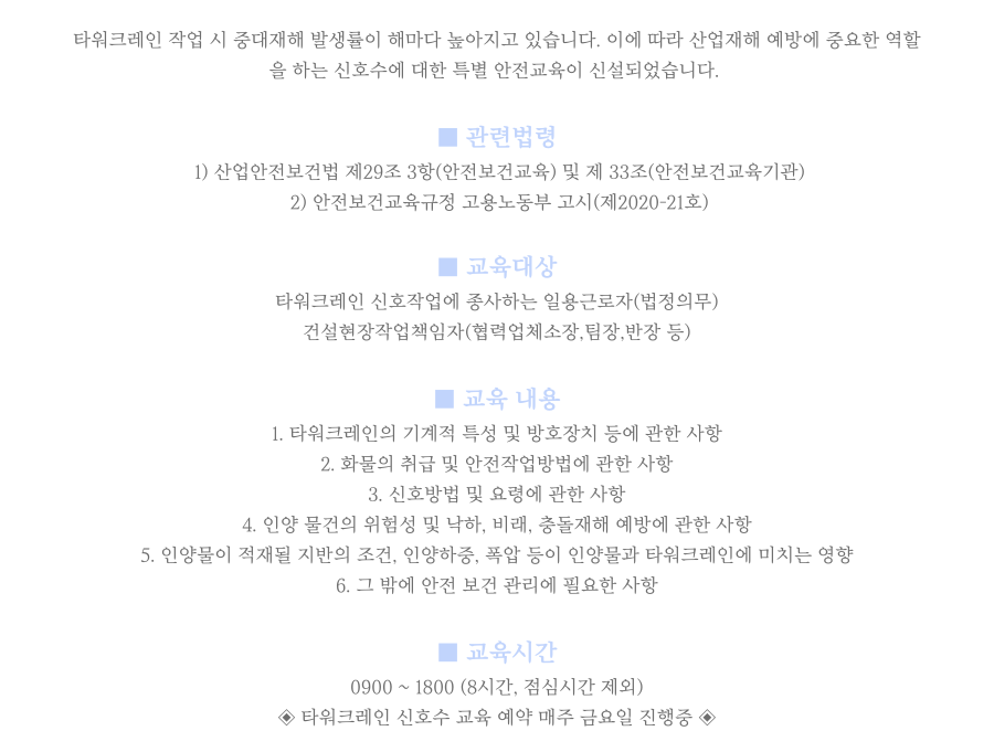 교육 안내 기관 소개 교육 안내 교육 신청 온라인 교육 자료실 고객센터 타워크레인 신호수 교육 관리감독자 교육 위험성평가 담당자 교육 건설업 기초안전보건교육 타워크레인 신호수 교육 5대 법정의무교육(온라인)