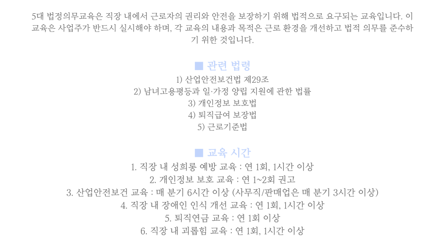 교육 안내 기관 소개 교육 안내 교육 신청 온라인 교육 자료실 고객센터 5대 법정의무교육(온라인) 관리감독자 교육 위험성평가 담당자 교육 건설업 기초안전보건교육 타워크레인 신호수 교육 5대 법정의무교육(온라인)